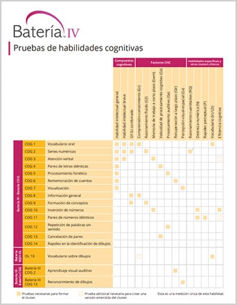 Revise todas las pruebas, dominios evaluados y niveles disponibles en esta tabla detallada.